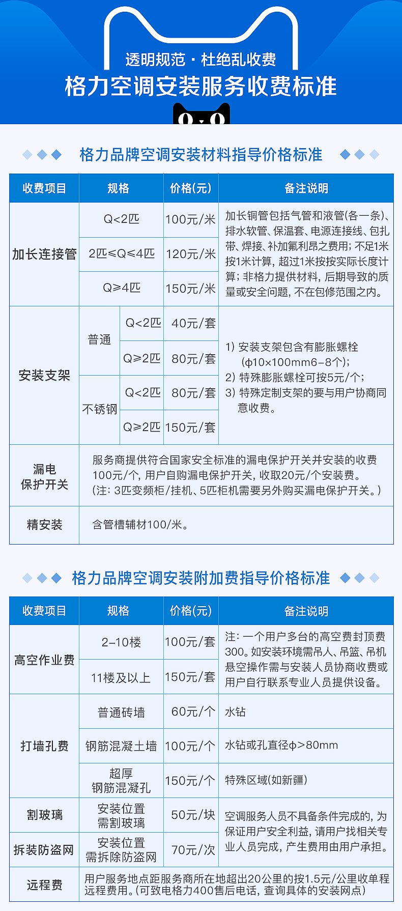 下面是格力空調官方安裝收費標準:
