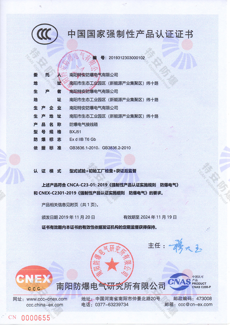 防爆電氣接線(xiàn)箱中國國家強制性認證證書(shū)(3C證書(shū))